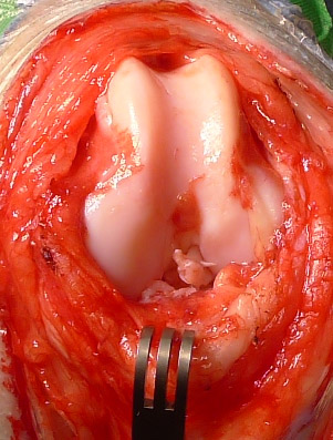前十字靭帯断裂は関節切開術や特殊検査である関節鏡検査にて最終的な確定診断を行います。関節切開術では目視による靭帯の断裂程度、半月板損傷の有無や骨棘形成などを評価することができます。損傷している靭帯は可能な限り除去し損傷している半月板の部分切除術を実施します。